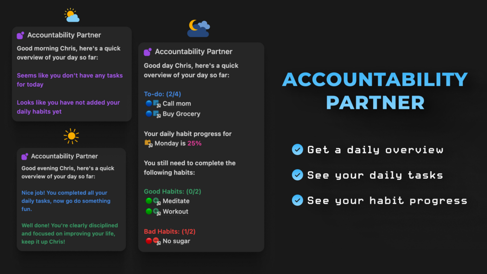 - You have an accountability partner showing an overview of your daily habit progress and the tasks you still need to complete
